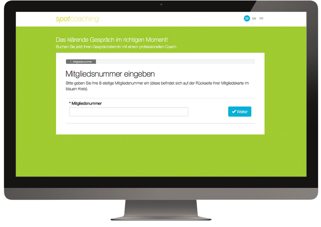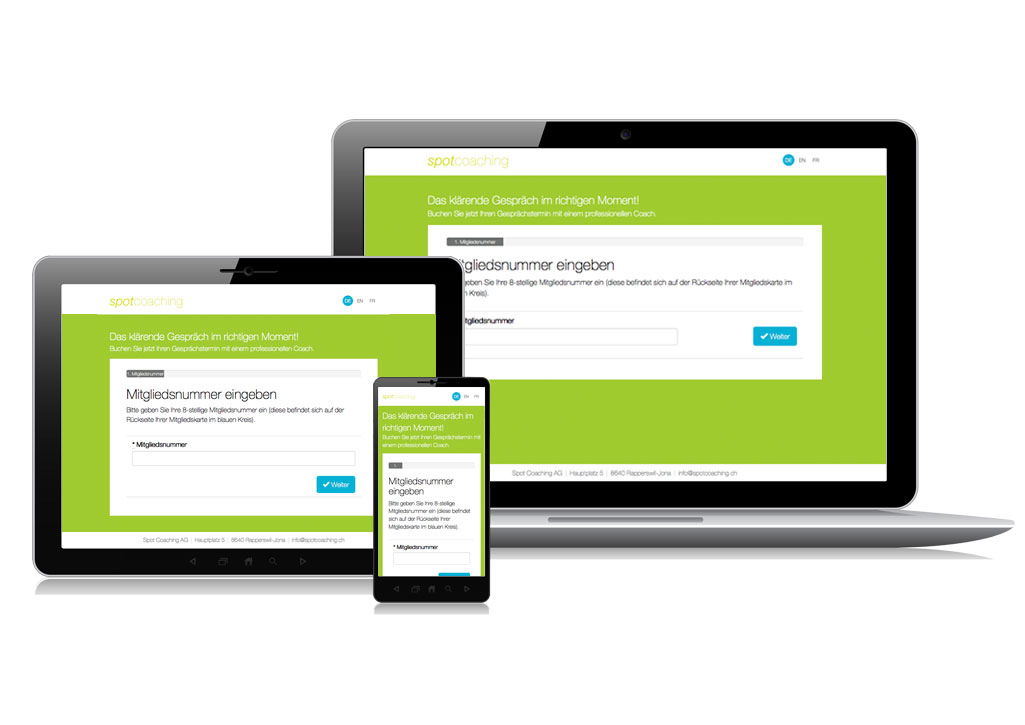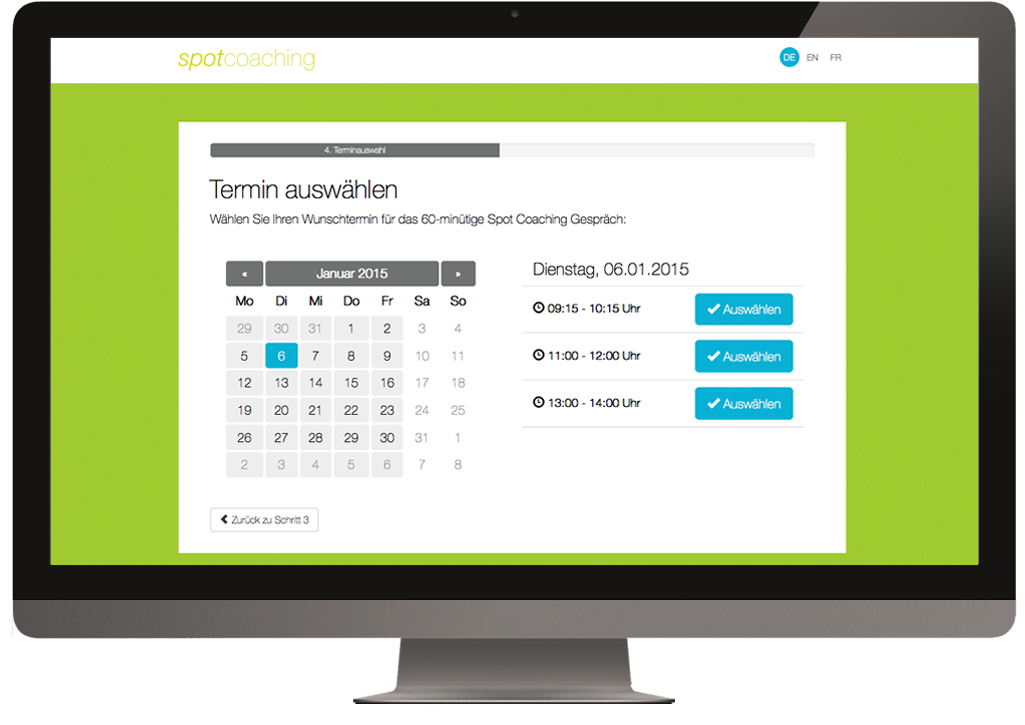 Spot Coaching ist ein kurzfristig vereinbartes Gespräch mit einem professionellen Coach zur Klärung von beruflichen Fragestellungen. Dabei entwickelte die Software Fabrik GmbH in enger Zusammenarbeit mit der Spot Coaching AG die webbasierte, mehrsprachige Endlösung zur Vereinbarung dieser Gespräche. Sämtliche, vereinbarte Gespräche werden anonymisiert vom System behandelt und folgen einem klar vordefinierten Ablaufs. In den verschiedenen Bereich der Webapplikation können Kunden zur Verfügung stehende Termine buchen und Coaches können ihre möglichen Gesprächstermine verwalten und anbieten.