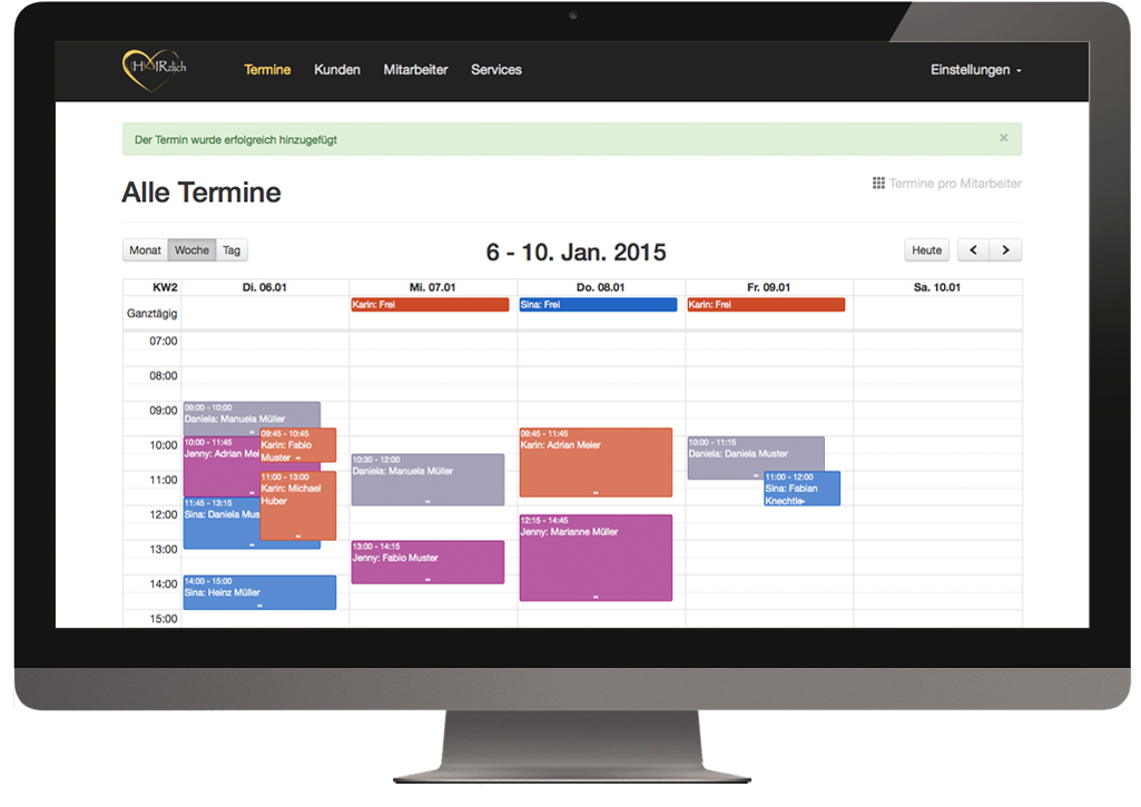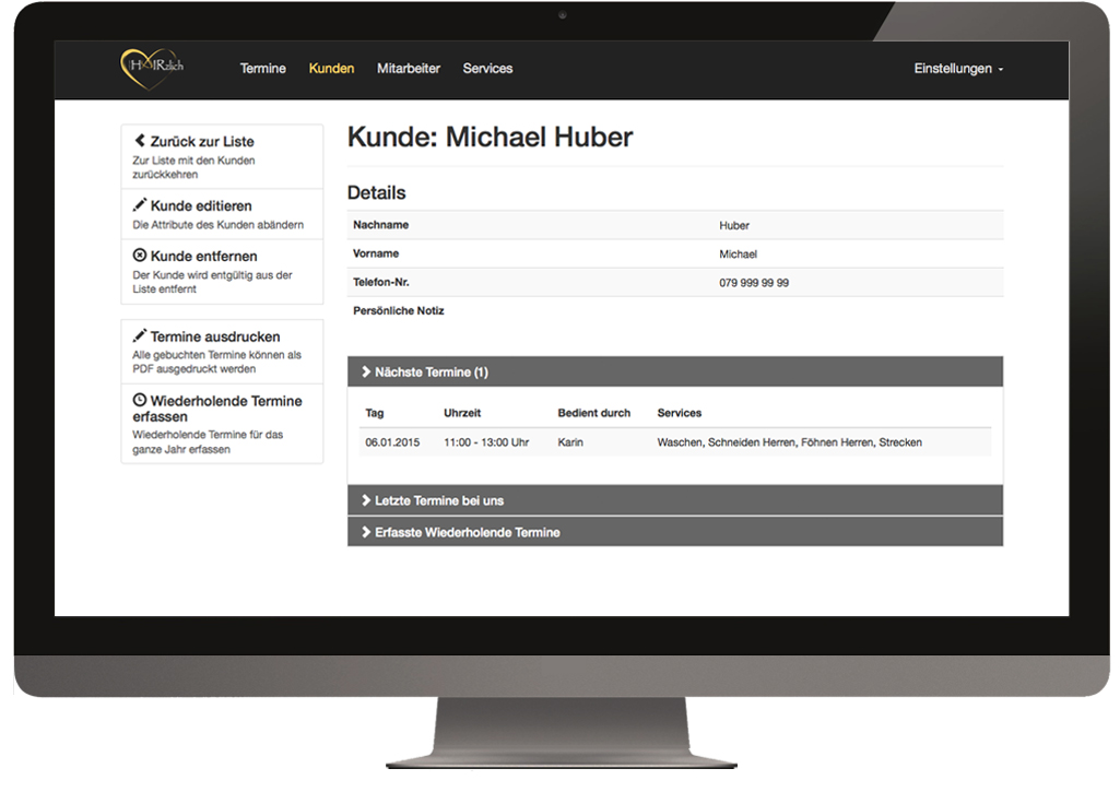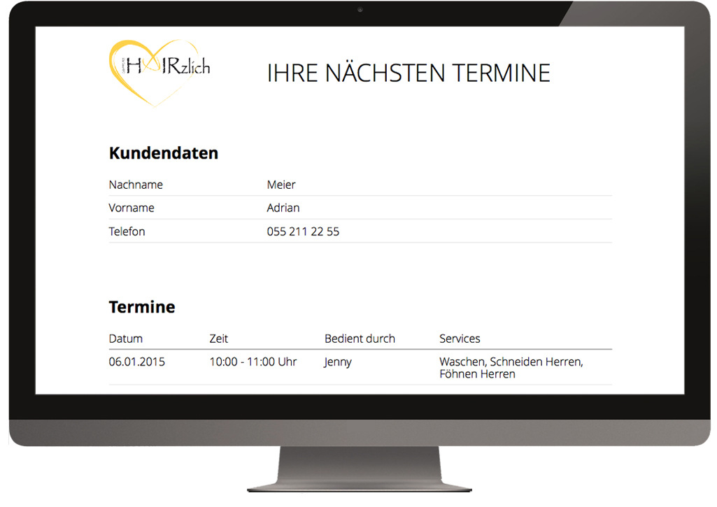 Für den Coiffure Hairzlich aus Rapperswil SG konnte die Software Fabrik eine digitale Lösung der gesamten Terminverwaltung entwickeln. Termine können im digitalen Kalender per Mausklick erstellt, verschoben und gelöscht werden. Verschiedene Ansichten (Monat, Woche, Tag, Mitarbeiter) im Kalender ermöglichen es, ständig den Überblick über alle Termine zu behalten. Wiederholende Kundentermine können für das ganze Jahr geplant und in einem personalisierten PDF ausgedruckt und als Reminder dem Kunden mitgegeben werden. Die Webapplikation kann über jedes internetfähige Gerät bedient werden (Responsive Design).